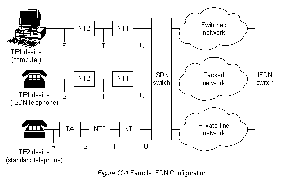 На Рис. 11-1 показан "Образец конфигурации ISDN". Нa рисунке изображены три устройства, подключенные к коммутатору ISDN , находящемуся на центральной станции. Два из этих устройства совместимы с ISDN, поэтому их можно подключить к устройствам NT2 через контрольную точку "S". Третье устройство (стандартный, не специализированный для ISDN тeлефон) подключается к ТА через контрольную точку "R". Любое из этих устройств может быть также подключено к устройству NT1/2, которое заменяет оба устройства- NТ1 и NT2. Аналогичные станции пользователей (не показанные на рисунке) подключены к самому правому переключателю ISDN.
