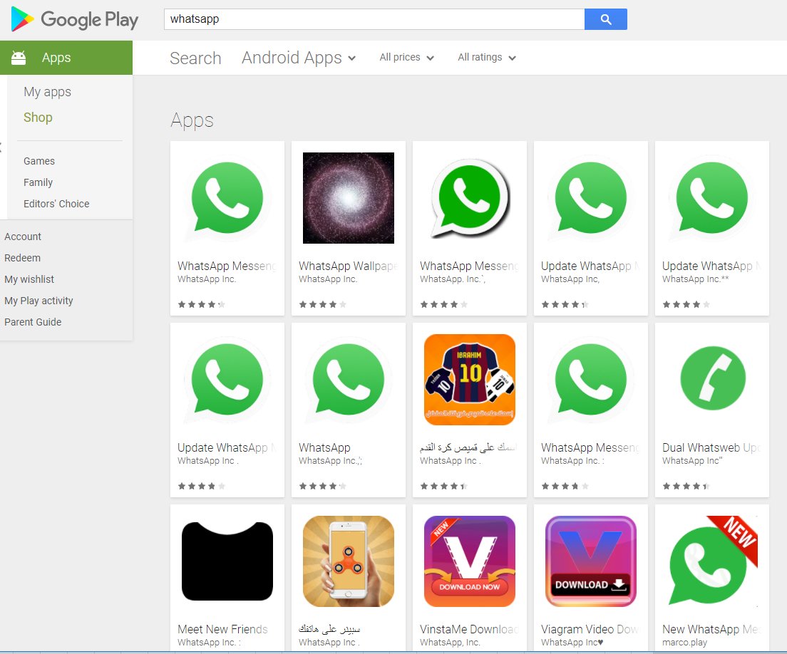 Зашел в плеймаркет, вписал whatsapp в поиск. Вывалило ссылку на оригинальное приложение еще до тыка "поиска". | ||